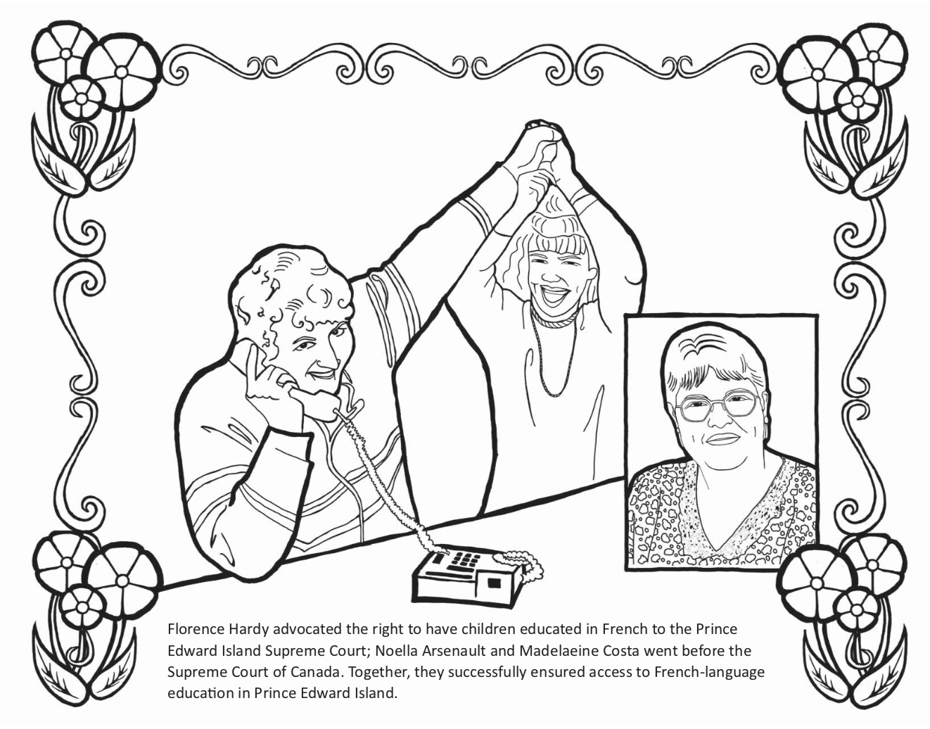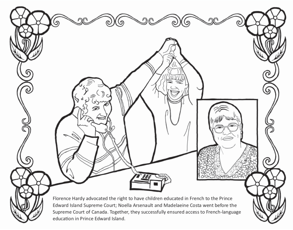 Here is a colouring sheet (created by the PEI Coalition for women in government) explaining and demonstrating this victorious day for all parents, children and members of PEI’s Francophone and Acadian community.