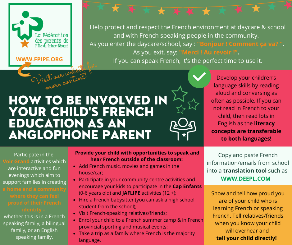 La Fédération des parents de l’ÎPÉ Inc. wants to take a more active role in supporting anglophone parents who we know want to be involved in their child’s French education as much as a francophone parent would. As a pilot project and based on parent feedback, here is some content that may be helpful to you, divided in the following 3 categories: French learning resources, Helpful information for parents, Important cultural events on PEI.