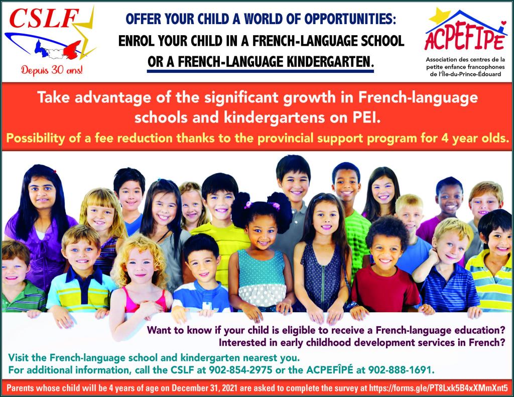 Registration at la Commission scolaire de langue française de l’ÎPÉ (PEI French school board) and at l’Association des centres de la petite enfance francophones (PEI French Early Learning Centres) for 2020-2021 school year.