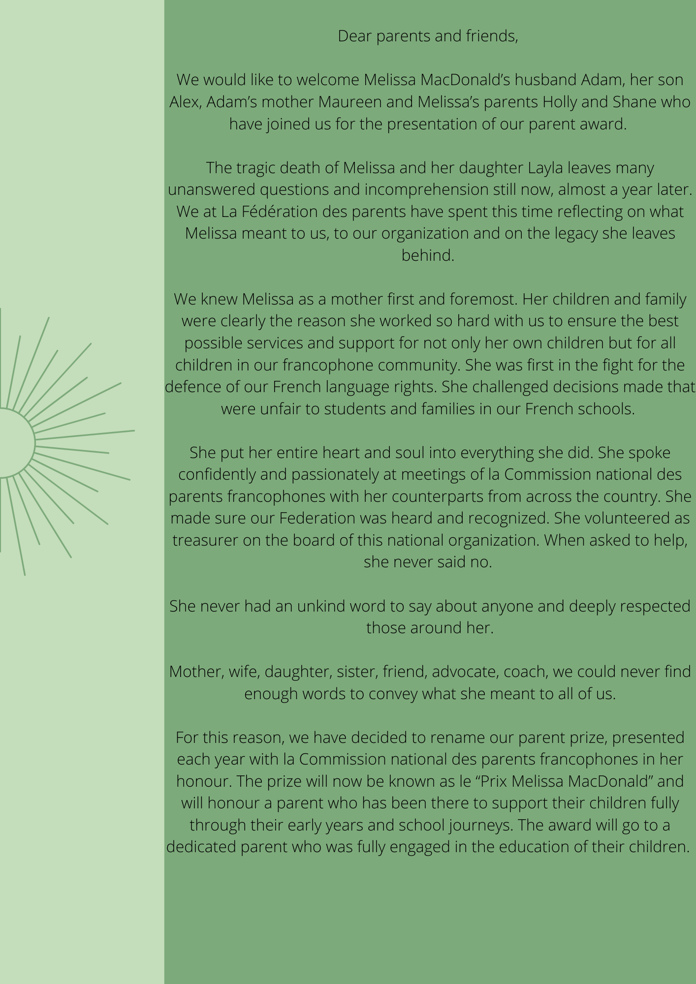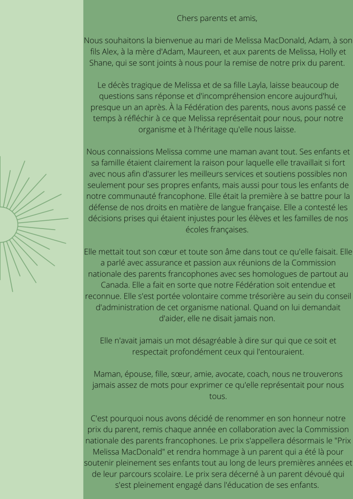 Lors de notre dernière Assemblée Générale Annuelle le 26 octobre 2022, la Fédération des parents a voulu rendre hommage à notre ancienne présidente Melissa MacDonald décédée tragiquement, avec sa fille Layla, il va bientôt y avoir 1 an. Pour cette occasion, nous avons invité son mari, Adam et sa famille afin de partager ce moment.